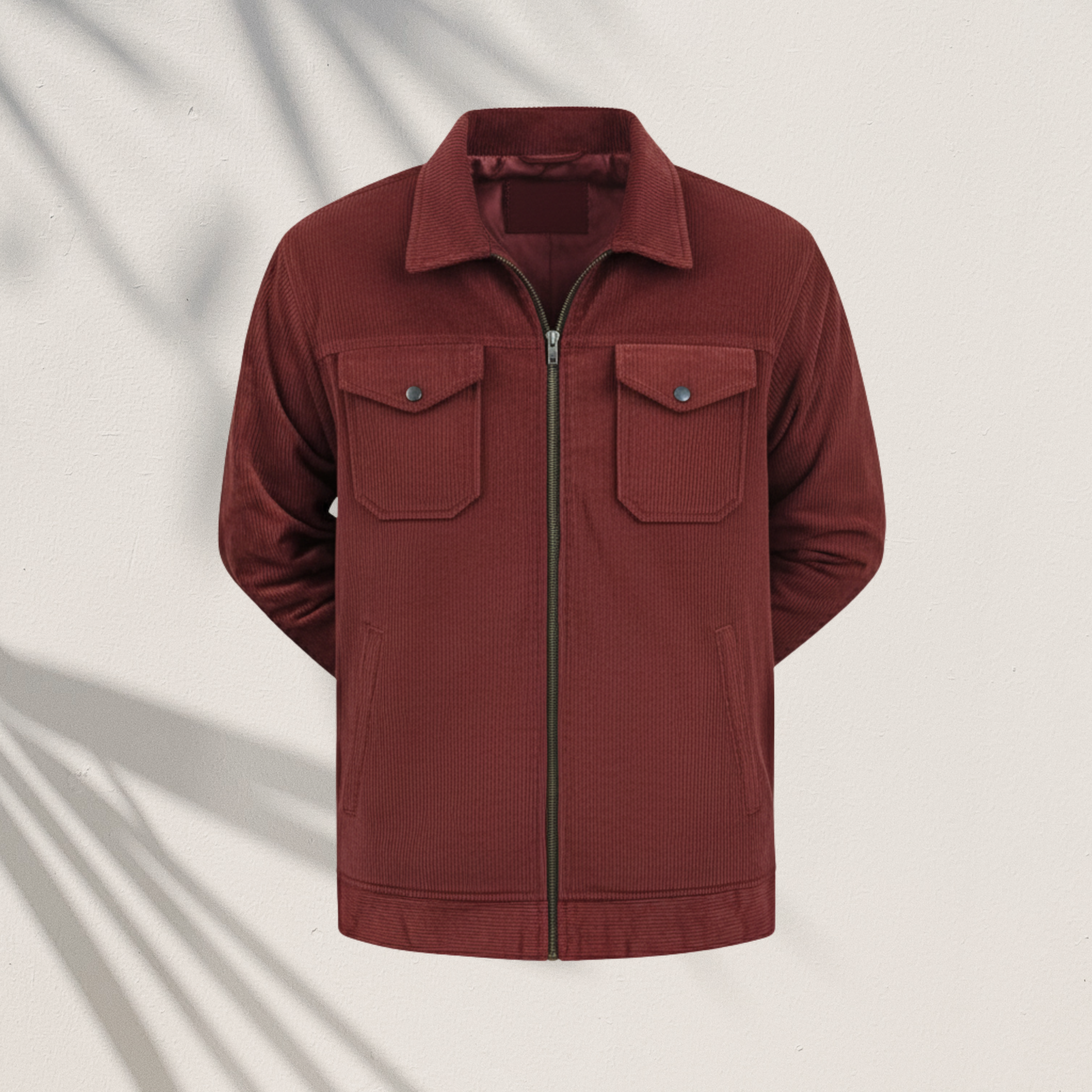 The CD-860 Maroon Corduroy Jacket is a standout piece, offering a sophisticated and vibrant alternative to traditional colors. This jacket features a rich, deep red tone perfect for making a stylish statement in the cooler seasons. It maintains the popular trucker jacket silhouette with a classic collar, full zip-front, and functional chest pockets. Made from a soft and durable corduroy, it provides comfortable warmth, making it an essential winter casual item for any modern man's wardrobe.