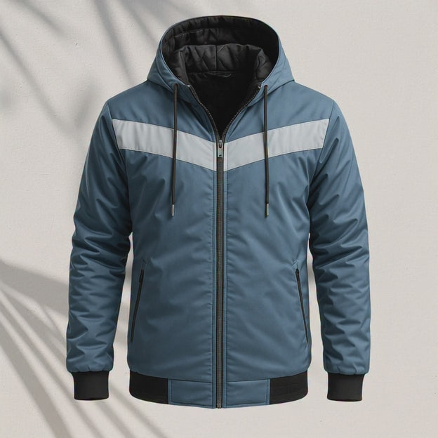 Elevate your everyday look with the Hooded Bomber Jacket. This sleek black outerwear piece is designed for the modern man, blending sharp streetwear style with superior warmth and durability. The defining feature is the bold chevron (V-stripe) across the chest, giving this jacket a distinct, athletic edge perfect for urban adventures.